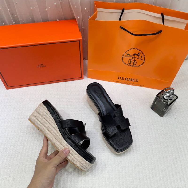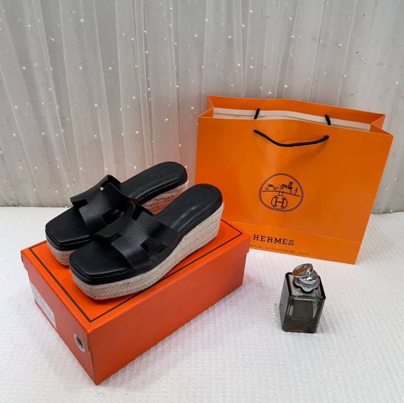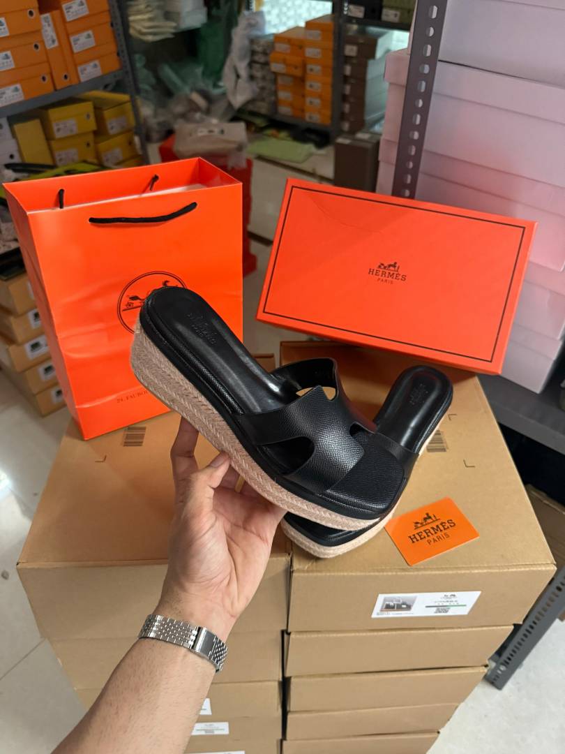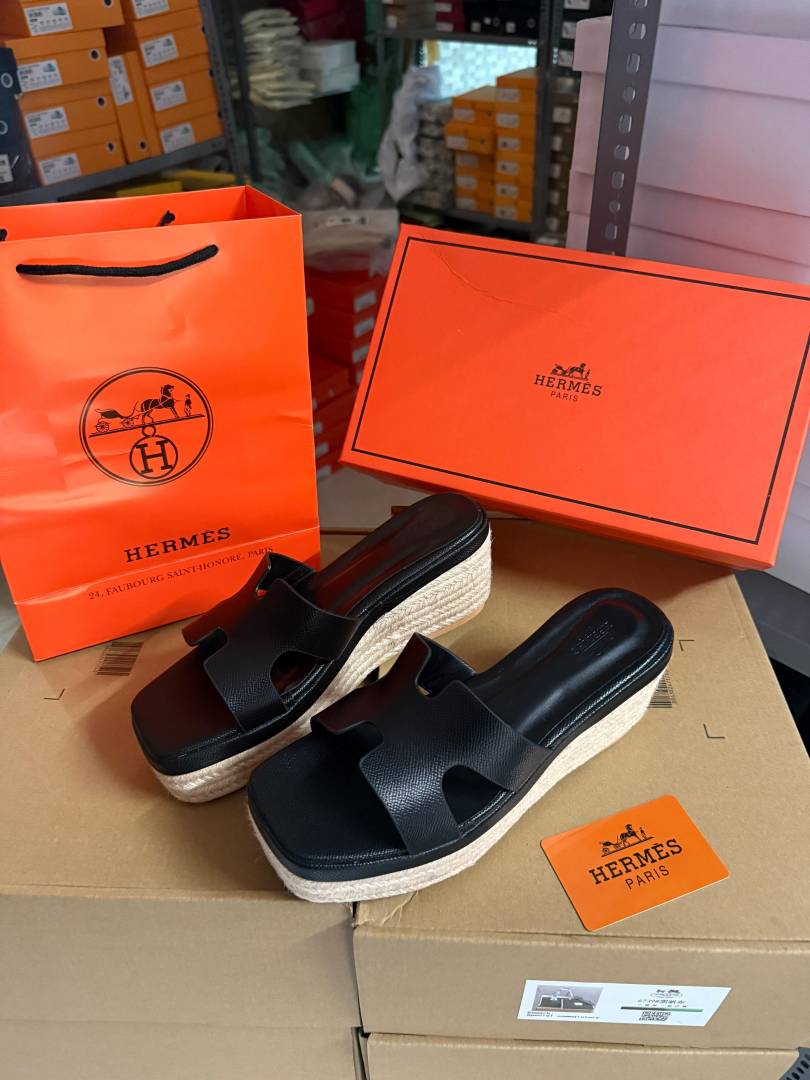 • Hermes Black Oran Wedge Platform Sandal Heel With OG Box & Carry Bag Black Leather